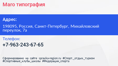 Maro, типография по адресу 198095, Россия, Санкт-Петербург, Михайловский переулок, 7а в дальнейшем Организация, размещена в следующих категориях: