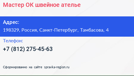 Мастер`ОК, швейное ателье по адресу 198329, Россия, Санкт-Петербург, Тамбасова, 4 в дальнейшем Организация, размещена в следующих категориях: