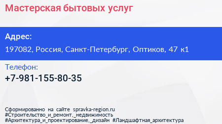 Мастерская бытовых услуг по адресу 197082, Россия, Санкт-Петербург, Оптиков, 47 к1 в дальнейшем Организация, размещена в следующих категориях: