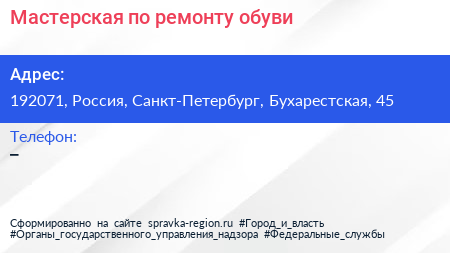 Мастерская по ремонту обуви по адресу 192071, Россия, Санкт-Петербург, Бухарестская, 45 в дальнейшем Организация, размещена в следующих категориях: