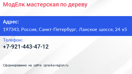 МодЕлк, мастерская по дереву по адресу 197343, Россия, Санкт-Петербург, Ланское шоссе, 24 к5 в дальнейшем Организация, размещена в следующих категориях: