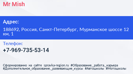 Mr. Mish по адресу 188692, Россия, Санкт-Петербург, Мурманское шоссе 12 км, 1 в дальнейшем Организация, размещена в следующих категориях: