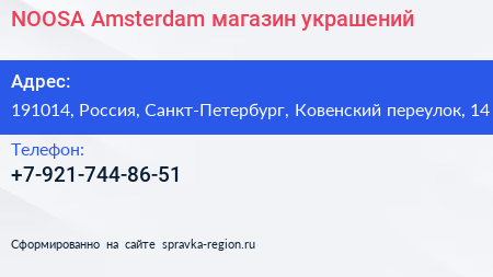NOOSA Amsterdam, магазин украшений по адресу 191014, Россия, Санкт-Петербург, Ковенский переулок, 14 в дальнейшем Организация, размещена в следующих категориях: