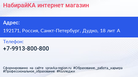 НабирайКА, интернет-магазин по адресу 192171, Россия, Санкт-Петербург, Дудко, 18 лит А в дальнейшем Организация, размещена в следующих категориях: