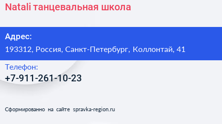 Natali, танцевальная школа по адресу 193312, Россия, Санкт-Петербург, Коллонтай, 41 в дальнейшем Организация, размещена в следующих категориях: