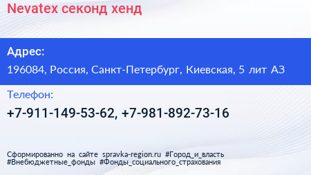 Nevatex, секонд-хенд по адресу 196084, Россия, Санкт-Петербург, Киевская, 5 лит АЗ в дальнейшем Организация, размещена в следующих категориях: