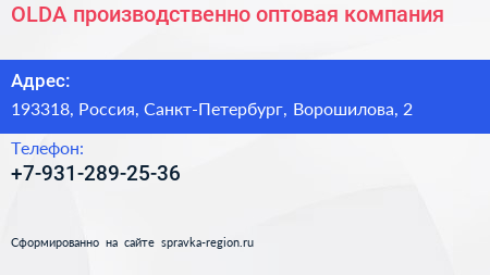 OLDA, производственно-оптовая компания по адресу 193318, Россия, Санкт-Петербург, Ворошилова, 2 в дальнейшем Организация, размещена в следующих категориях: