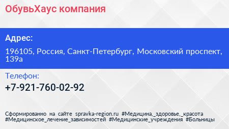 ОбувьХаус, компания по адресу 196105, Россия, Санкт-Петербург, Московский проспект, 139а в дальнейшем Организация, размещена в следующих категориях: