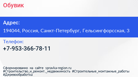 Обувик по адресу 194044, Россия, Санкт-Петербург, Гельсингфорсская, 3 в дальнейшем Организация, размещена в следующих категориях: