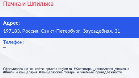 Пачка и Шпилька по адресу 197183, Россия, Санкт-Петербург, Заусадебная, 31 в дальнейшем Организация, размещена в следующих категориях: