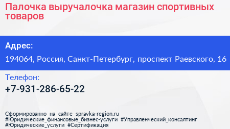 Палочка-выручалочка, магазин спортивных товаров по адресу 194064, Россия, Санкт-Петербург, проспект Раевского, 16 в дальнейшем Организация, размещена в следующих категориях: