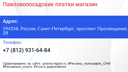 Павловопосадские платки, магазин по адресу 194358, Россия, Санкт-Петербург, проспект Просвещения, 28 в дальнейшем Организация, размещена в следующих категориях: