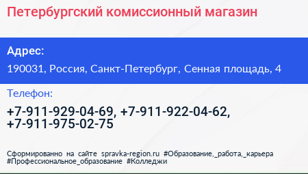Петербургский, комиссионный магазин по адресу 190031, Россия, Санкт-Петербург, Сенная площадь, 4 в дальнейшем Организация, размещена в следующих категориях: