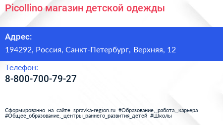 Picollino, магазин детской одежды по адресу 194292, Россия, Санкт-Петербург, Верхняя, 12 в дальнейшем Организация, размещена в следующих категориях: