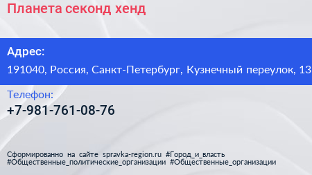 Планета, секонд-хенд по адресу 191040, Россия, Санкт-Петербург, Кузнечный переулок, 13 в дальнейшем Организация, размещена в следующих категориях: