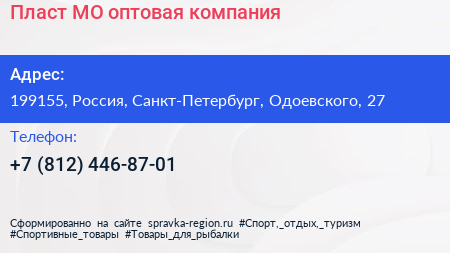 Пласт МО, оптовая компания по адресу 199155, Россия, Санкт-Петербург, Одоевского, 27 в дальнейшем Организация, размещена в следующих категориях: