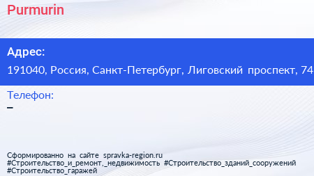 Purmurin по адресу 191040, Россия, Санкт-Петербург, Лиговский проспект, 74 в дальнейшем Организация, размещена в следующих категориях:
