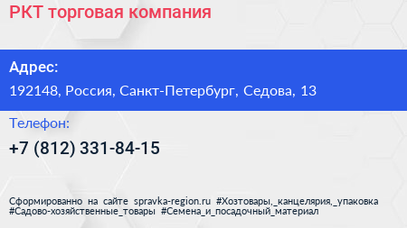 РКТ, торговая компания по адресу 192148, Россия, Санкт-Петербург, Седова, 13 в дальнейшем Организация, размещена в следующих категориях: