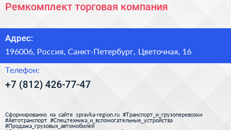 Ремкомплект, торговая компания по адресу 196006, Россия, Санкт-Петербург, Цветочная, 16 в дальнейшем Организация, размещена в следующих категориях:
