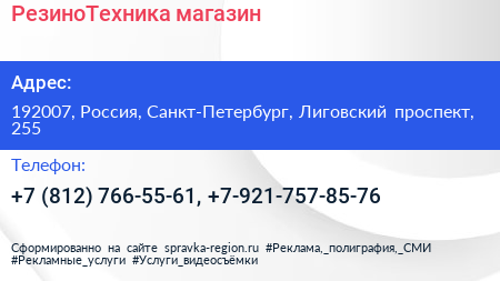 РезиноТехника, магазин по адресу 192007, Россия, Санкт-Петербург, Лиговский проспект, 255 в дальнейшем Организация, размещена в следующих категориях: