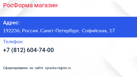 РосФорма, магазин по адресу 192236, Россия, Санкт-Петербург, Софийская, 17 в дальнейшем Организация, размещена в следующих категориях: