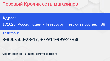 Розовый Кролик, сеть магазинов по адресу 191025, Россия, Санкт-Петербург, Невский проспект, 88 в дальнейшем Организация, размещена в следующих категориях: