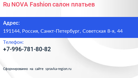 Ru-NOVA-Fashion, салон платьев по адресу 191144, Россия, Санкт-Петербург, Советская 8-я, 44 в дальнейшем Организация, размещена в следующих категориях: