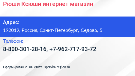 Рюши Ксюши, интернет-магазин по адресу 192019, Россия, Санкт-Петербург, Седова, 5 в дальнейшем Организация, размещена в следующих категориях: