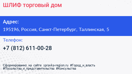 ШЛИФ, торговый дом по адресу 195196, Россия, Санкт-Петербург, Таллинская, 5 в дальнейшем Организация, размещена в следующих категориях: