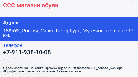 ССС, магазин обуви по адресу 188692, Россия, Санкт-Петербург, Мурманское шоссе 12 км, 1 в дальнейшем Организация, размещена в следующих категориях: