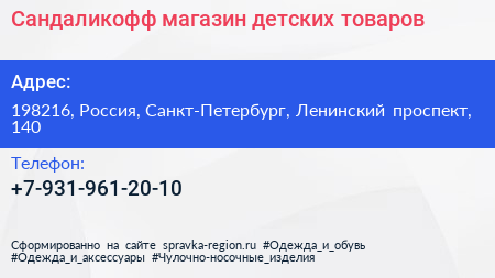 Сандаликофф, магазин детских товаров по адресу 198216, Россия, Санкт-Петербург, Ленинский проспект, 140 в дальнейшем Организация, размещена в следующих категориях: