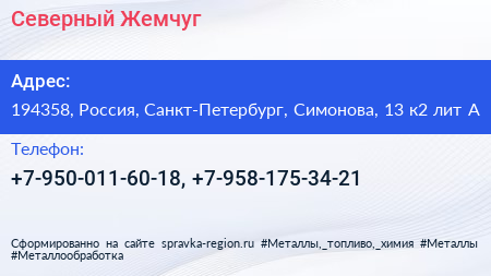 Северный Жемчуг по адресу 194358, Россия, Санкт-Петербург, Симонова, 13 к2 лит А в дальнейшем Организация, размещена в следующих категориях: