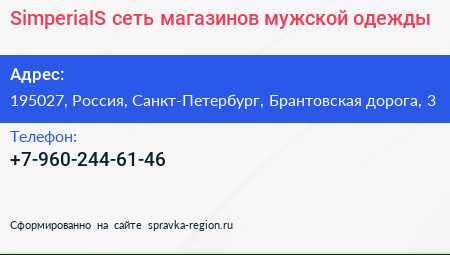 SimperialS, сеть магазинов мужской одежды по адресу 195027, Россия, Санкт-Петербург, Брантовская дорога, 3 в дальнейшем Организация, размещена в следующих категориях: