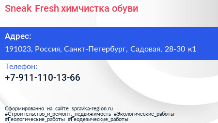 Sneak & Fresh, химчистка обуви по адресу 191023, Россия, Санкт-Петербург, Садовая, 28-30 к1 в дальнейшем Организация, размещена в следующих категориях: