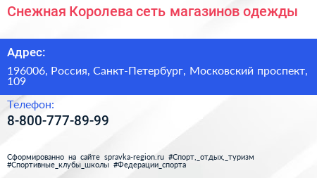 Снежная Королева, сеть магазинов одежды по адресу 196006, Россия, Санкт-Петербург, Московский проспект, 109 в дальнейшем Организация, размещена в следующих категориях: