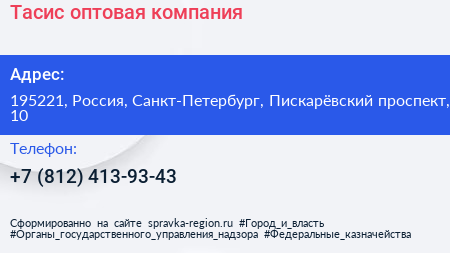 Тасис, оптовая компания по адресу 195221, Россия, Санкт-Петербург, Пискарёвский проспект, 10 в дальнейшем Организация, размещена в следующих категориях: