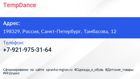 TempDance по адресу 198329, Россия, Санкт-Петербург, Тамбасова, 12 в дальнейшем Организация, размещена в следующих категориях: