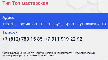 Тип-Топ, мастерская по адресу 198152, Россия, Санкт-Петербург, Краснопутиловская, 10 в дальнейшем Организация, размещена в следующих категориях: