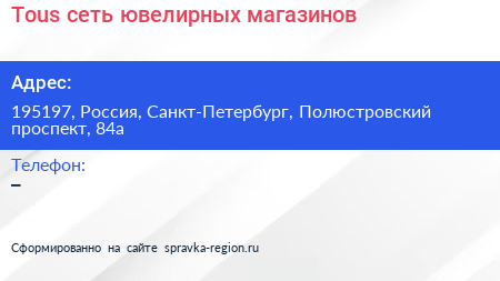 Tous, сеть ювелирных магазинов по адресу 195197, Россия, Санкт-Петербург, Полюстровский проспект, 84а в дальнейшем Организация, размещена в следующих категориях: