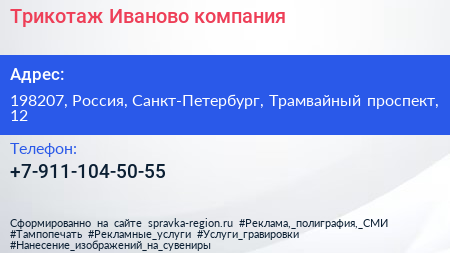Трикотаж Иваново, компания по адресу 198207, Россия, Санкт-Петербург, Трамвайный проспект, 12 в дальнейшем Организация, размещена в следующих категориях: