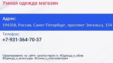 Умная одежда, магазин по адресу 194358, Россия, Санкт-Петербург, проспект Энгельса, 154 в дальнейшем Организация, размещена в следующих категориях: