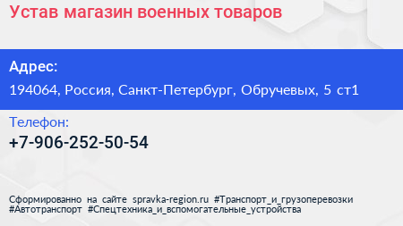 Устав, магазин военных товаров по адресу 194064, Россия, Санкт-Петербург, Обручевых, 5 ст1 в дальнейшем Организация, размещена в следующих категориях: