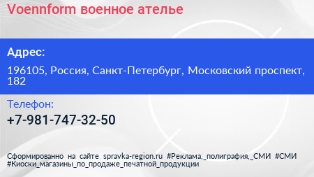 Voennform, военное ателье по адресу 196105, Россия, Санкт-Петербург, Московский проспект, 182 в дальнейшем Организация, размещена в следующих категориях: