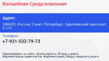 Волшебная Среда, компания по адресу 188692, Россия, Санкт-Петербург, Европейский проспект, 2 ст1 в дальнейшем Организация, размещена в следующих категориях: