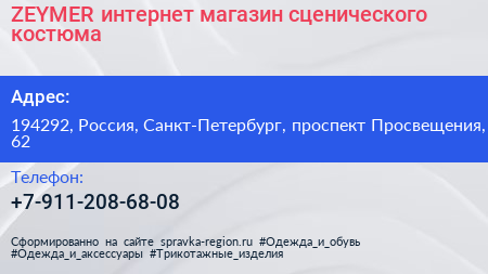 ZEYMER, интернет-магазин сценического костюма по адресу 194292, Россия, Санкт-Петербург, проспект Просвещения, 62 в дальнейшем Организация, размещена в следующих категориях: