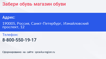 Забери обувь, магазин обуви по адресу 190005, Россия, Санкт-Петербург, Измайловский проспект, 12 в дальнейшем Организация, размещена в следующих категориях: