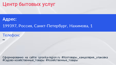 Центр бытовых услуг по адресу 199397, Россия, Санкт-Петербург, Нахимова, 1 в дальнейшем Организация, размещена в следующих категориях: