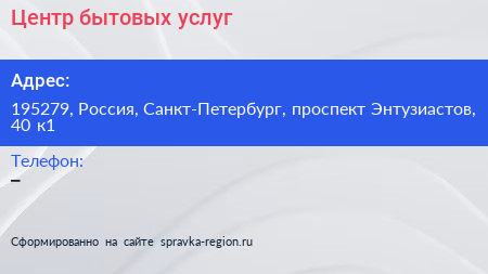Центр бытовых услуг по адресу 195279, Россия, Санкт-Петербург, проспект Энтузиастов, 40 к1 в дальнейшем Организация, размещена в следующих категориях: