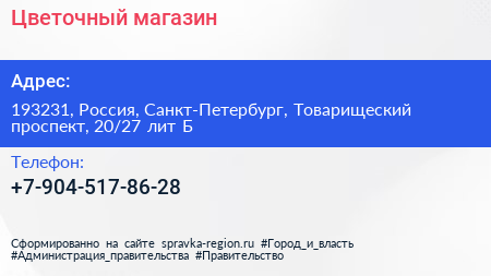 Цветочный магазин по адресу 193231, Россия, Санкт-Петербург, Товарищеский проспект, 20/27 лит Б в дальнейшем Организация, размещена в следующих категориях: