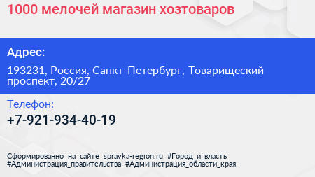 1000 мелочей, магазин хозтоваров по адресу 193231, Россия, Санкт-Петербург, Товарищеский проспект, 20/27 в дальнейшем Организация, размещена в следующих категориях: